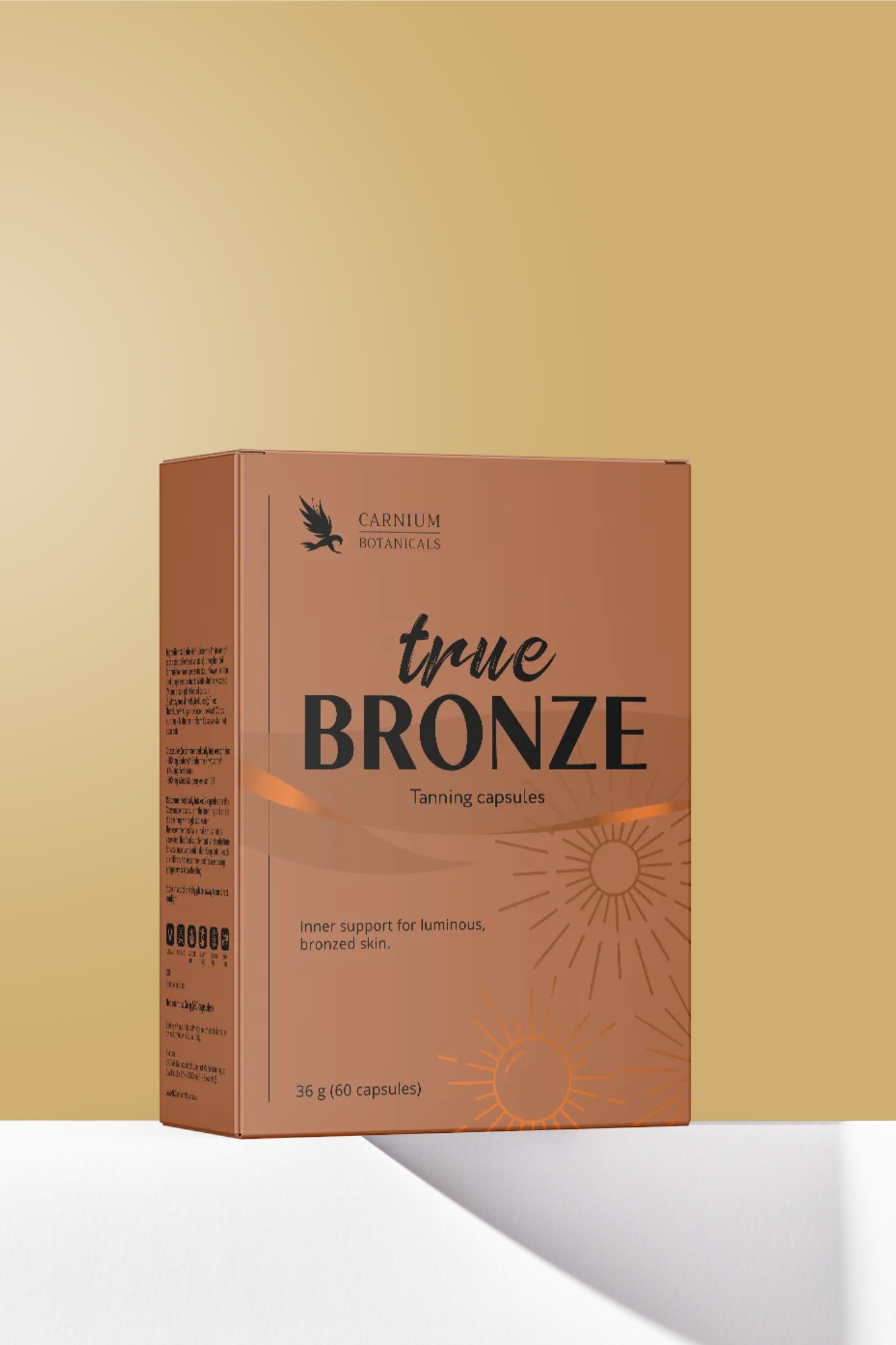Les capsules de bronzage TrueBronze sont ton allié naturel pour un teint éclatant et beau qui dure toutes les saisons. Sa combinaison soigneusement sélectionnée de bêta-carotène, de lycopène ainsi que d'astaxanthine est idéale pour tous ceux qui souhaitent obtenir un bronzage délicat ainsi qu'une peau soignée sans exposition inutile au soleil ou à des produits artificiels.