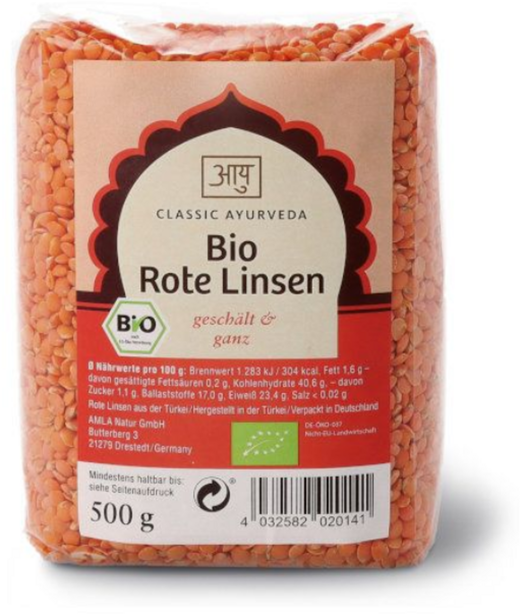 Les lentilles rouges sont un ingrédient très apprécié de l’alimentation ayurvédique, car elles sont déjà décortiquées et nécessitent un temps de cuisson court. À l’état brut, la légumineuse possède une enveloppe violette à brune, tandis que le cœur rouge n’apparaît qu’après le décorticage. En raison de leur texture, elles se délitent facilement à la cuisson et conviennent donc parfaitement à la préparation de dals onctueux, de soupes ou de ragoûts.