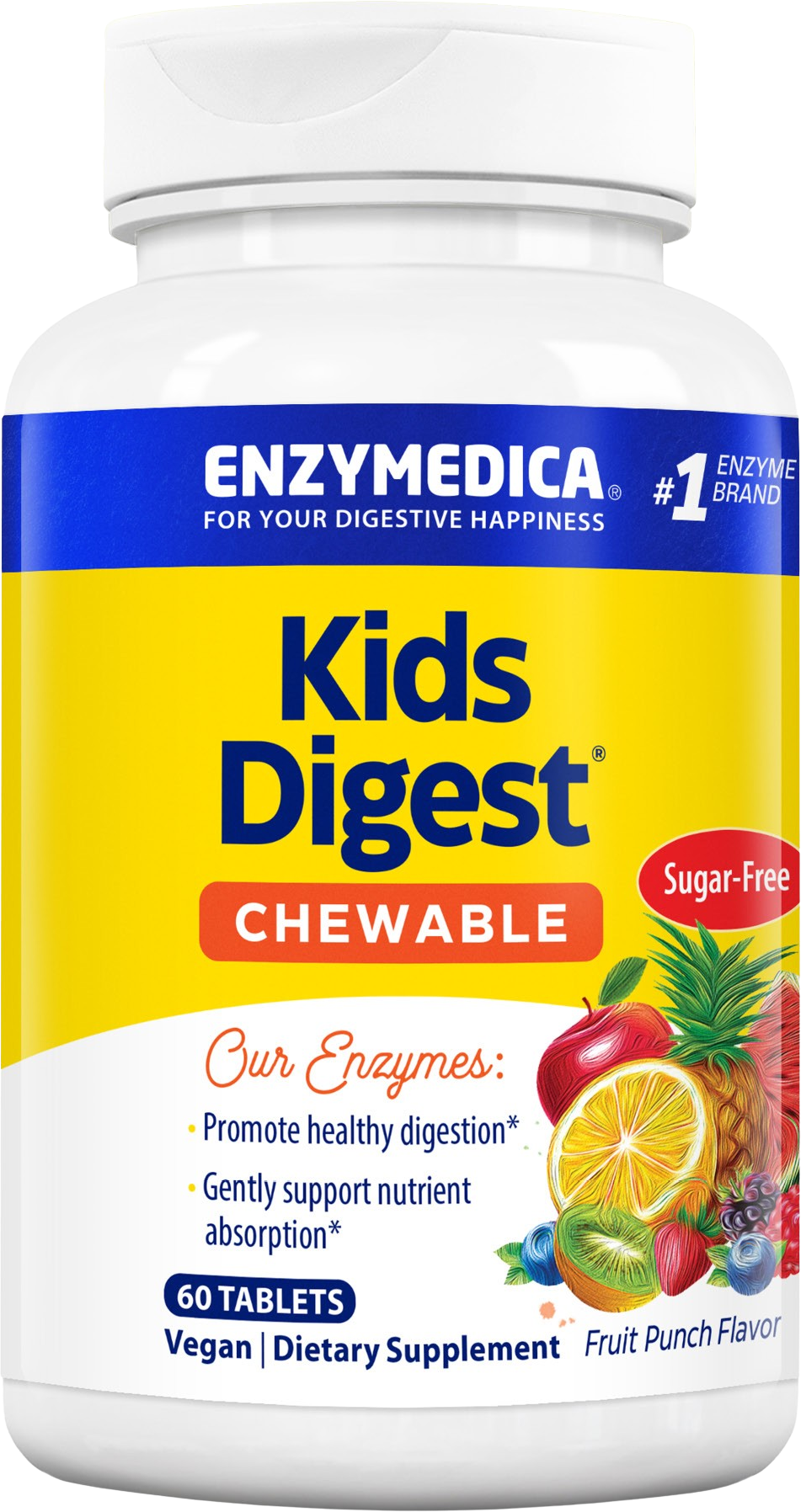 Kids Digest® Chewable contient une sélection ciblée d’enzymes, adaptée à la dégradation des glucides, des graisses, des fibres alimentaires et des protéines. Les comprimés à mâcher séduisent par leur goût Fruit Punch adapté aux enfants et utilisent la technologie Thera-blend® afin que les enzymes puissent rester actives sur l’ensemble du spectre de pH de l’organisme. La formule est sans sucre et soutient l’assimilation des repas quotidiens. Les comprimés sont entièrement végétaux, sans soja ni produits laitiers, et fabriqués sans recours aux organismes génétiquement modifiés.