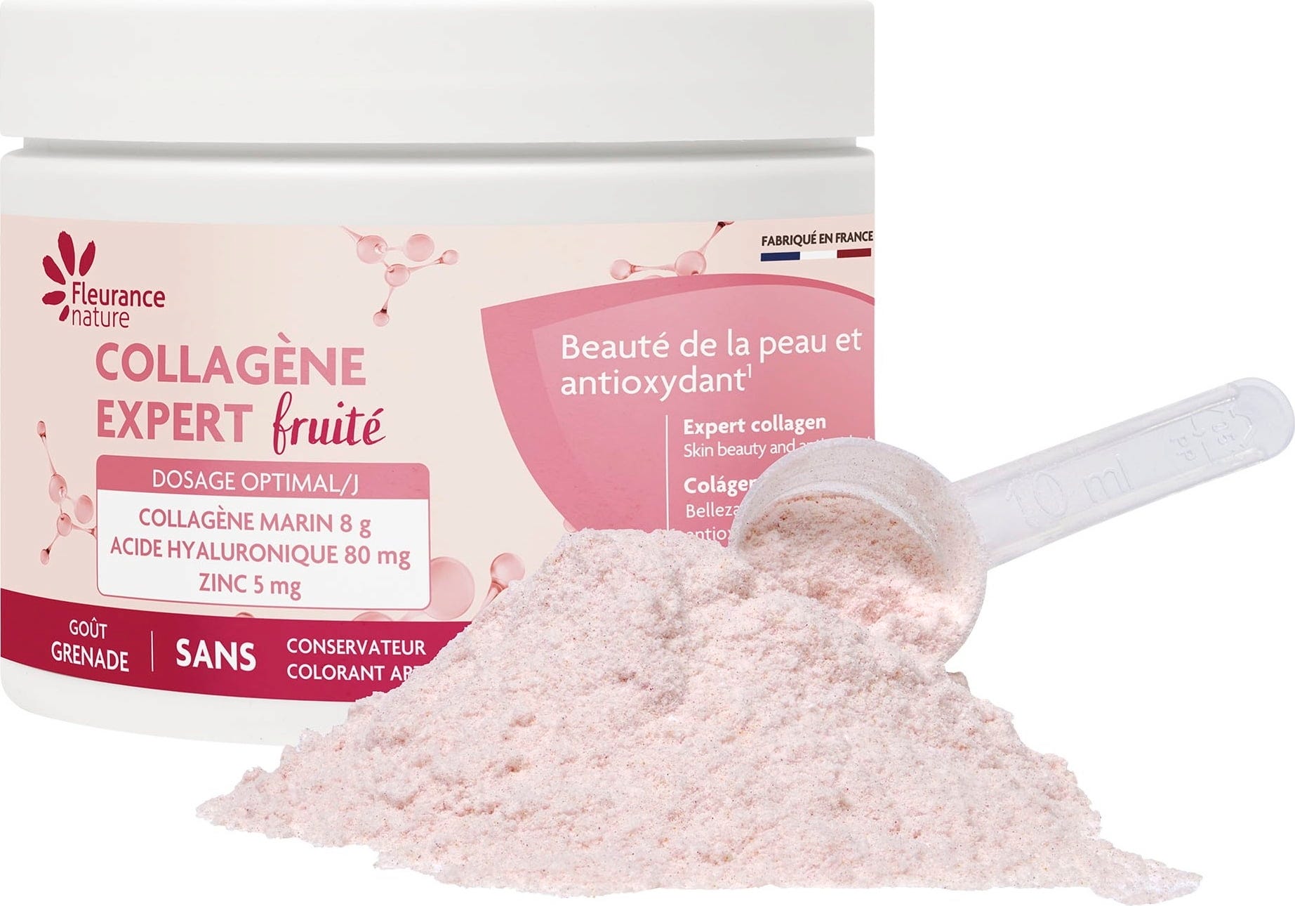 Hydrolysat de collagène marin (Poisson), Maltodextrine, Arôme naturel, acidulant (acide citrique), Jus de betterave rouge en poudre, Natriumhyaluronat (Acide hyaluronique), Colorant (Bêta-carotène), Gluconate de zinc, Edulcorant (Glycosides de stéviol de Stevia)