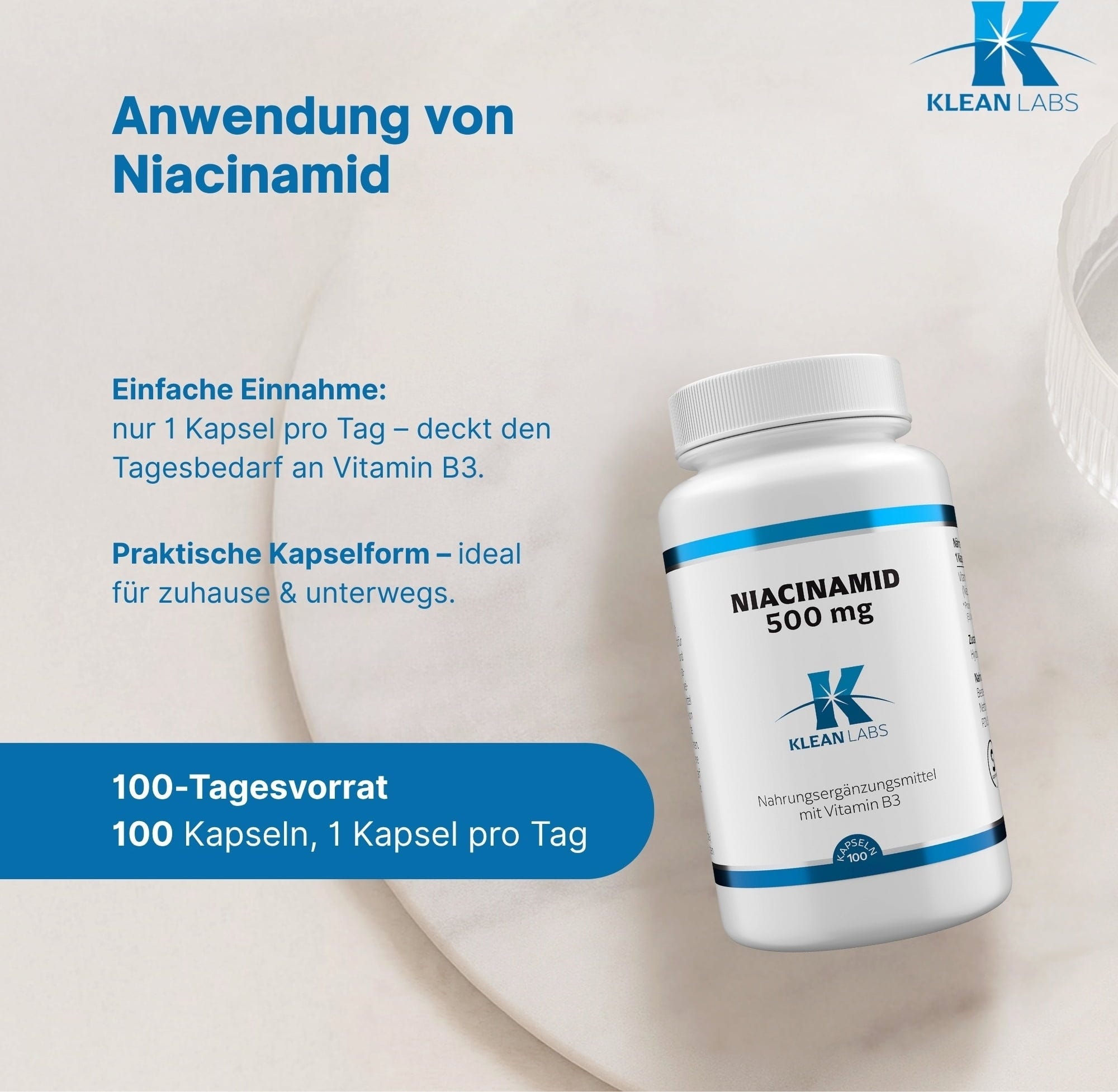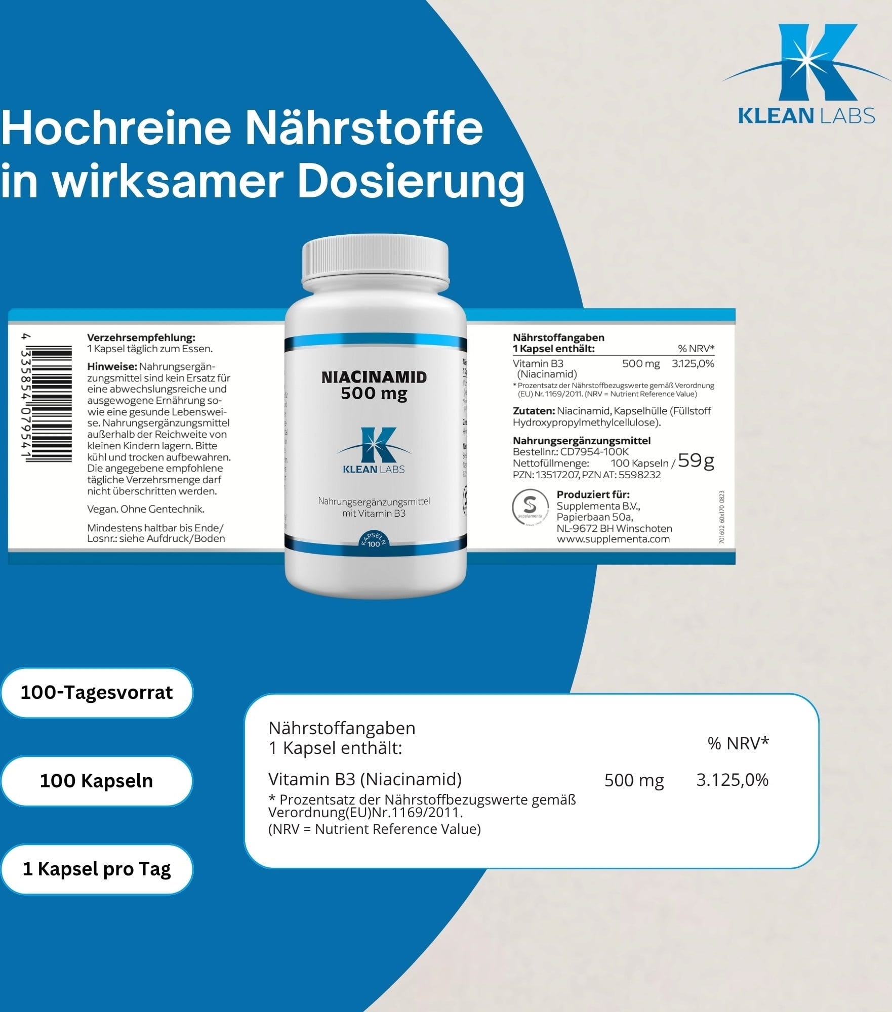 KLEAN LABS Niacinamide (B3) 500 mg, 100 gélules