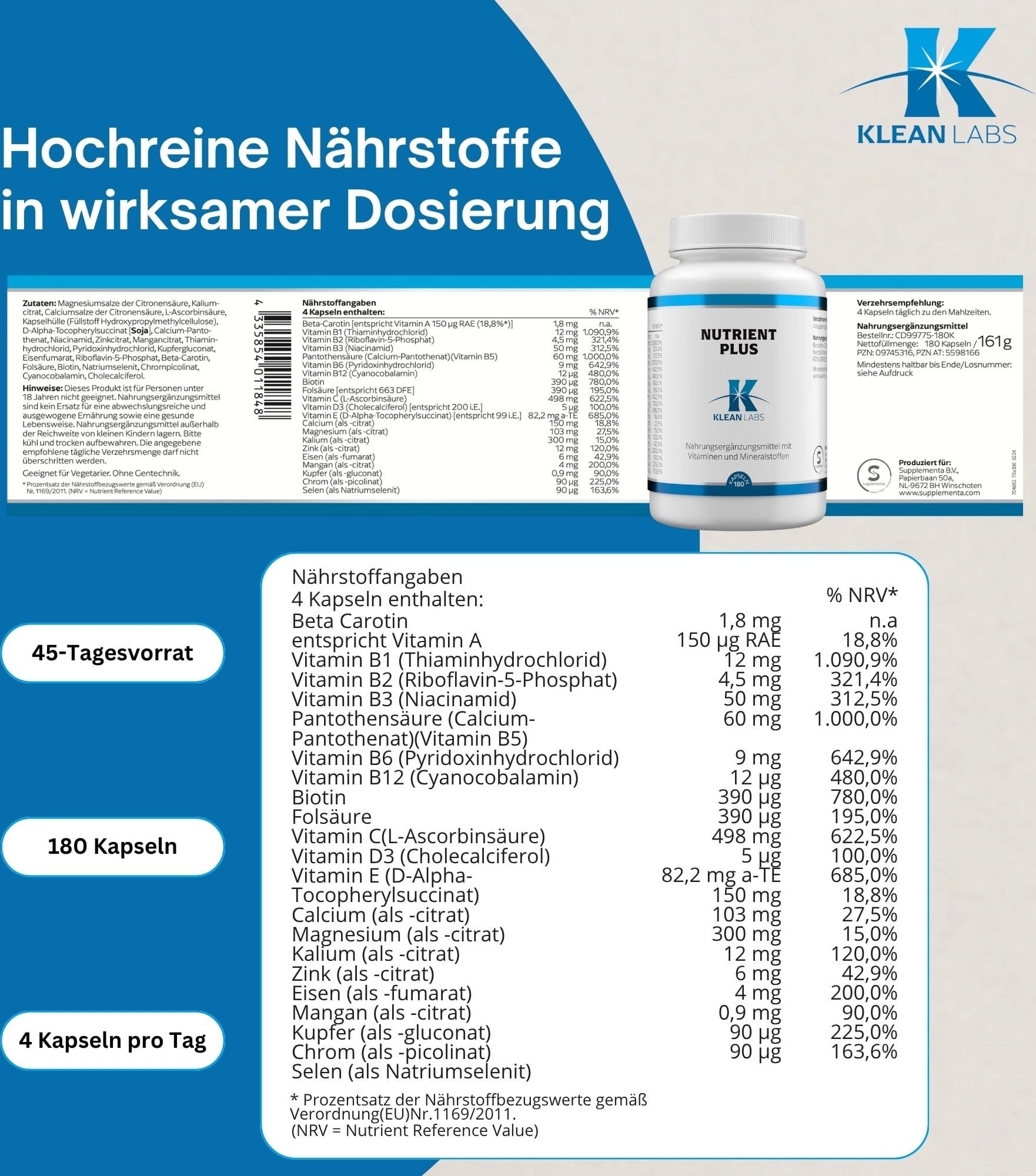 KLEAN LABS Nutrient Plus, 180 gélules