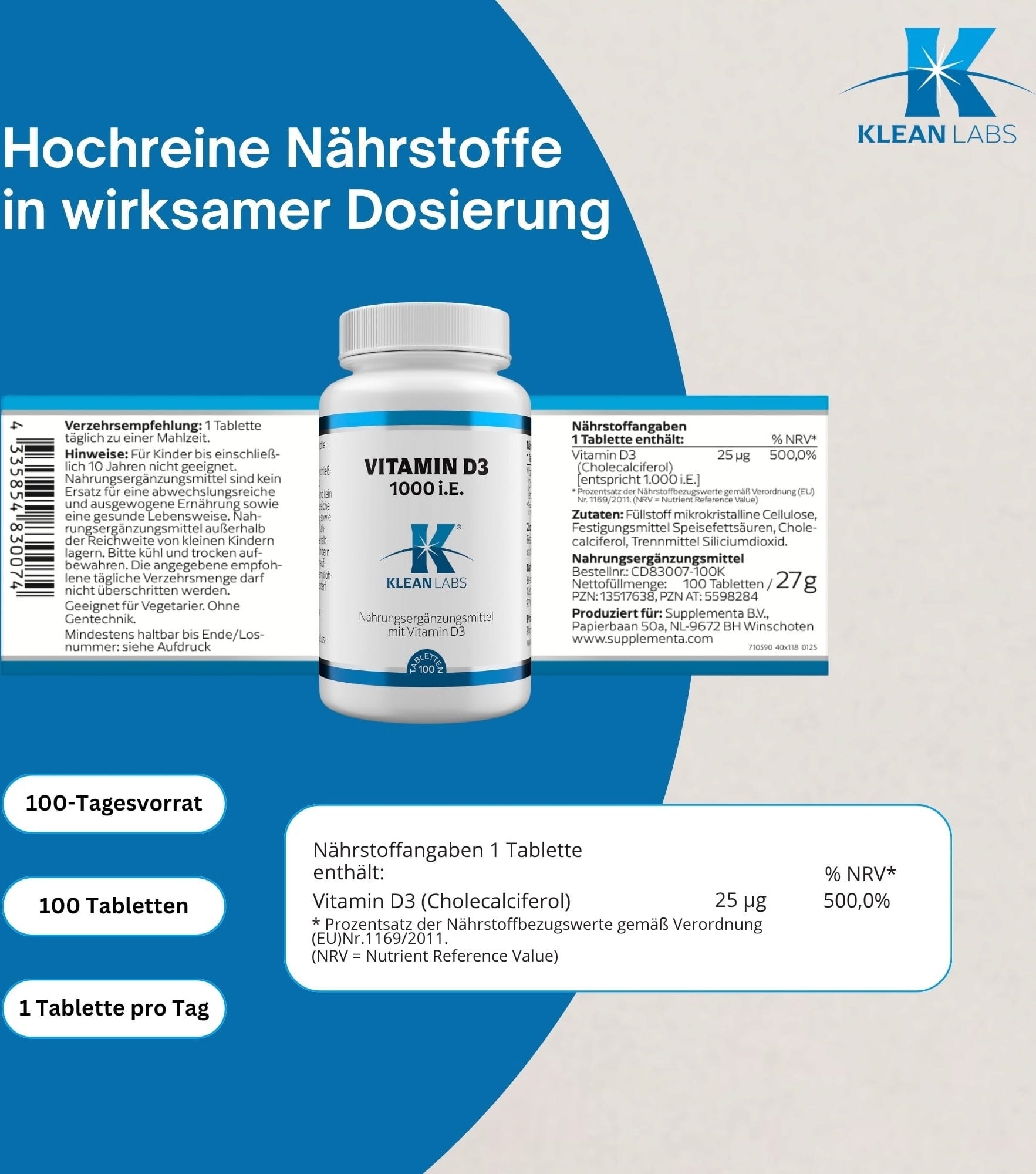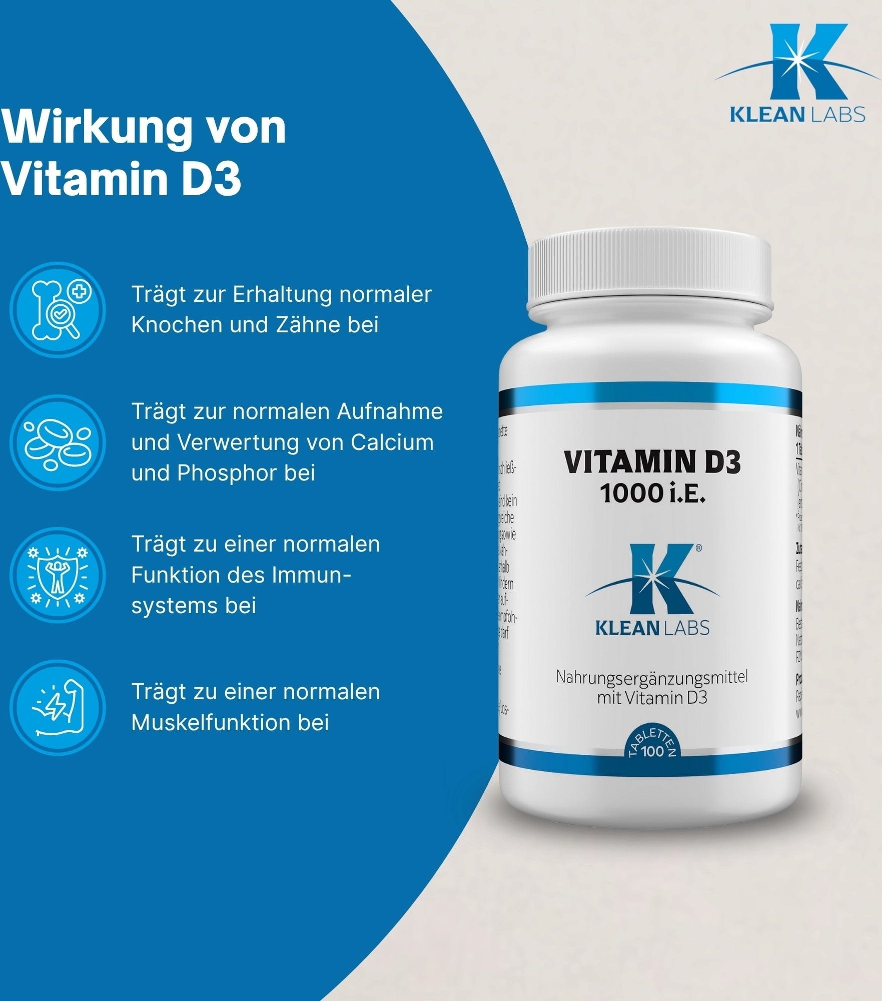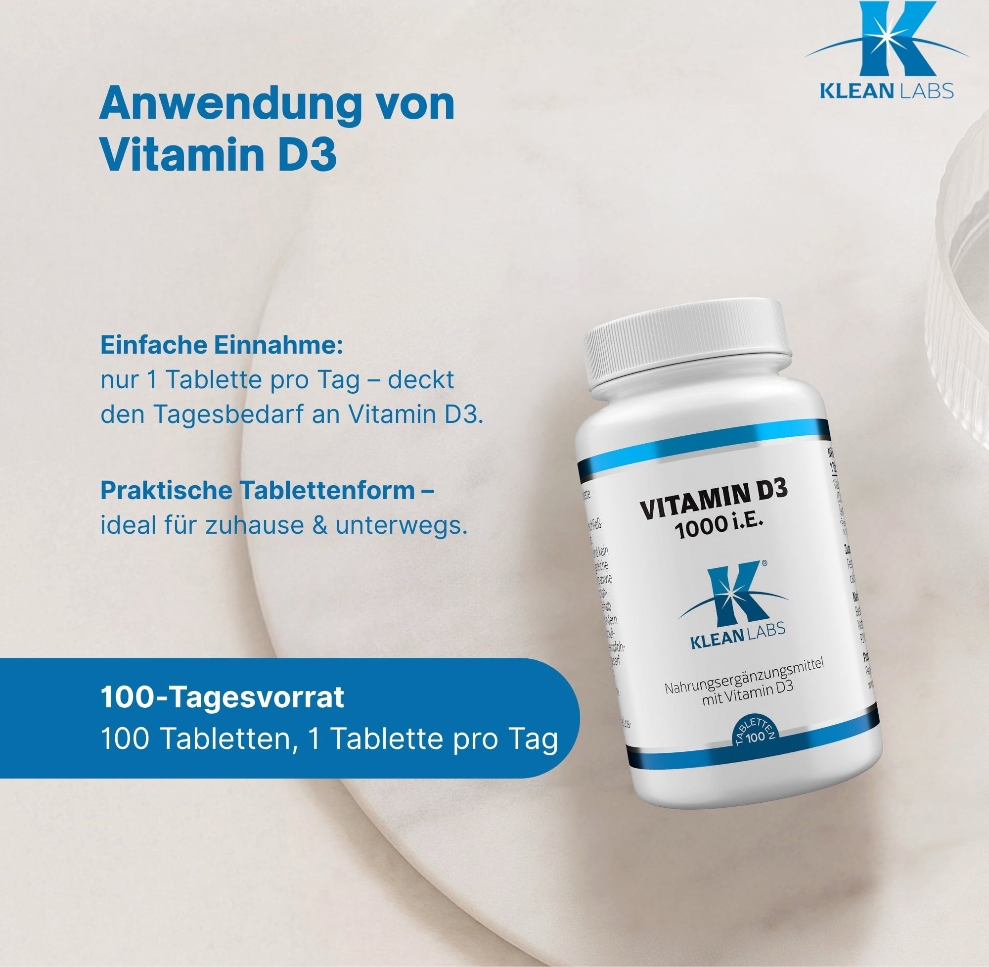 KLEAN LABS Vitamine D3 1000 UI, 100 comprimés
