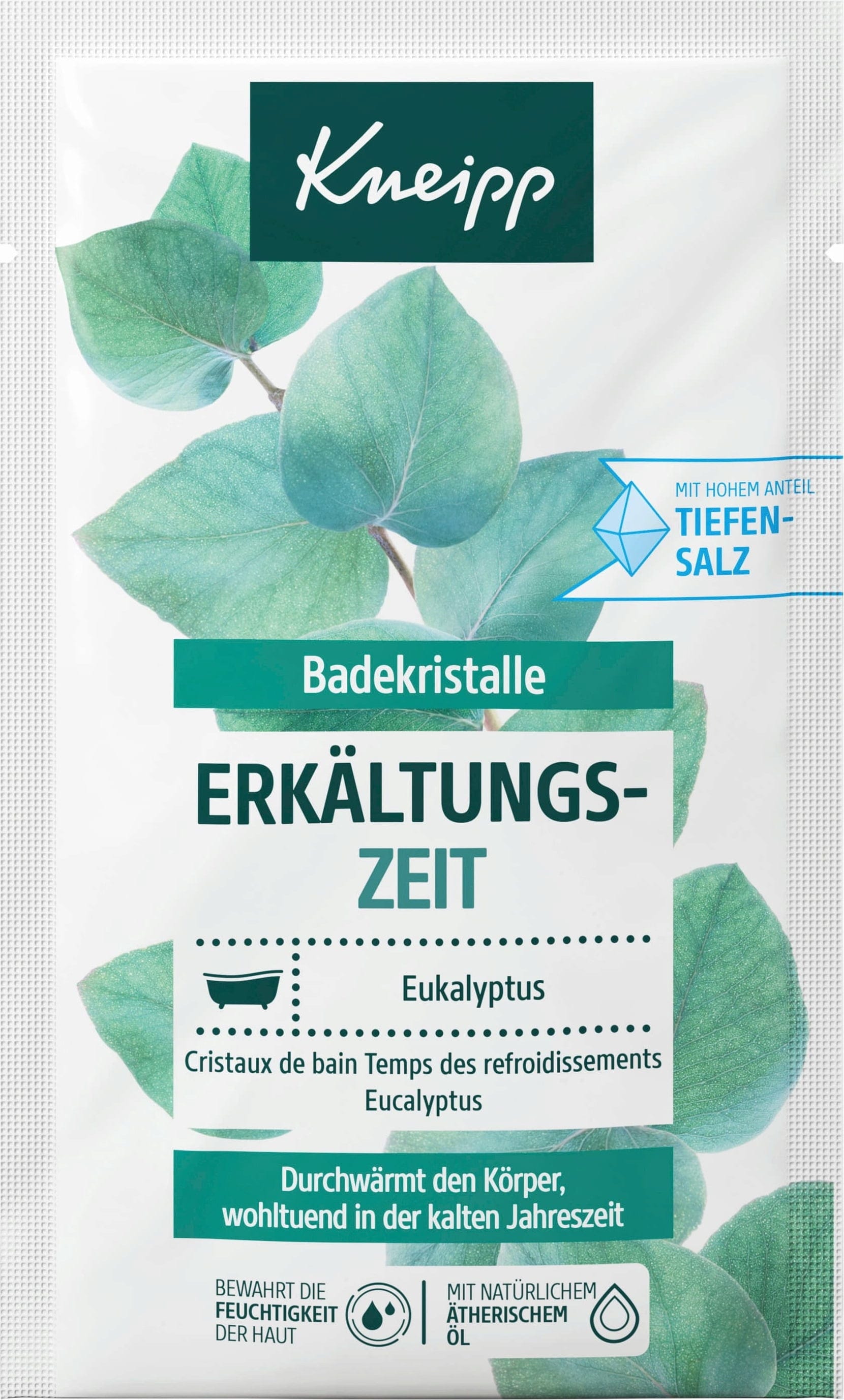 Les cristaux de bain Kneipp "Temps de refroidissement" contiennent de la précieuse huile essentielle d'eucalyptus qui, lorsqu'elle est dissoute dans l'eau, diffuse un parfum clair et frais. La forte teneur en sel profond naturel, extrait à 460 mètres de profondeur de la saumure d'une mer primitive vieille de 250 millions d'années, garantit une expérience de bain particulière dans tes propres murs. La formule douce aide en outre ta peau à conserver son hydratation - idéal pour tous ceux qui aspirent à un moment de bain avec une fraîcheur naturelle.