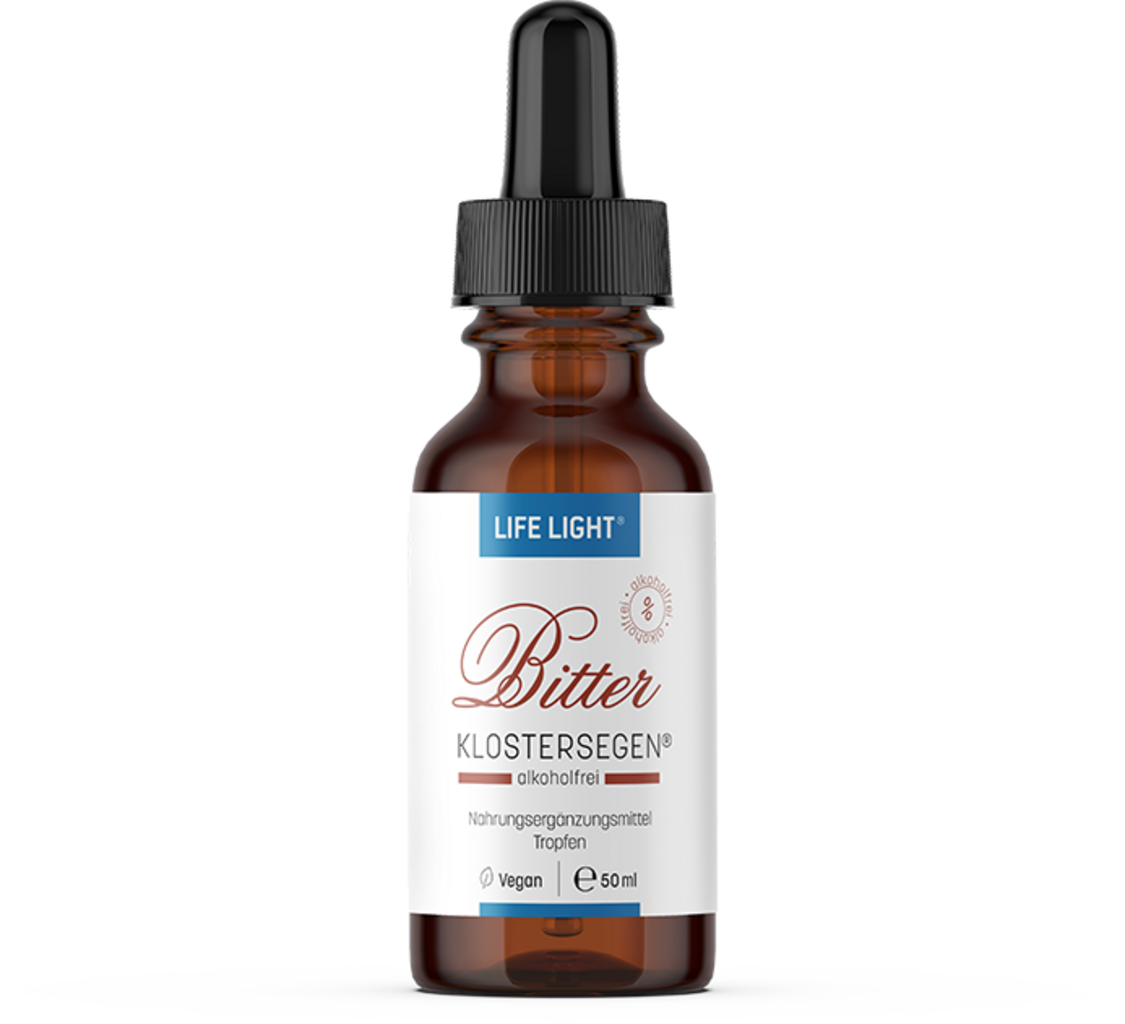 Les gouttes amères Klostersegen sans alcool de Life Light associent de nombreux amers traditionnels issus des traditions chinoise et ayurvédique, tels qu’ils étaient déjà utilisés par Hildegarde de Bingen. Cette formule harmonieuse est élaborée à base de vinaigre de cidre, ce qui la rend particulièrement douce. Grâce à la pipette pratique, les gouttes se dosent facilement et avec précision.