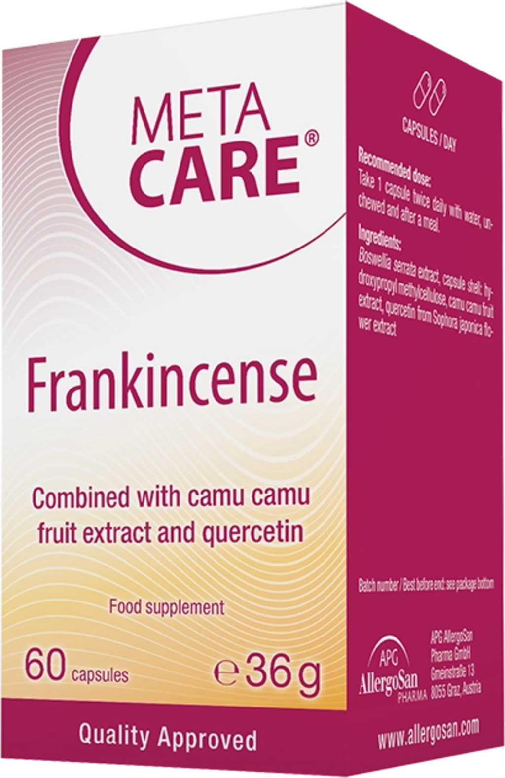 META-CARE® Frankincense contient non seulement un extrait de haute qualité d’encens indien, riche en acides boswelliques, mais aussi de la quercétine et de la vitamine C issue d’extrait de fruit de camu-camu. Les gélules sont 100 % véganes et garanties sans OGM.