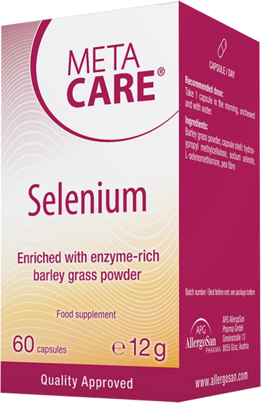Les gélules META-CARE® Selenium contiennent 200 µg de sélénium de haute qualité par gélule et sont enrichies en poudre d’herbe d’orge. Le sélénium est un oligo-élément essentiel, indispensable au bon fonctionnement de nombreuses enzymes et protéines dans l’organisme. Les gélules sont véganes et garanties sans OGM.