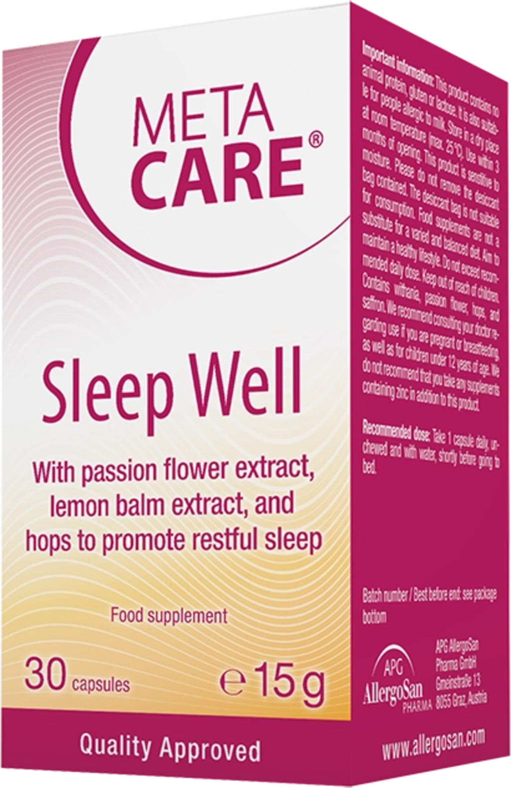 Les gélules META-CARE® Sleep Well contiennent un mélange de 5 extraits végétaux (passiflore, mélisse, houblon, ashwagandha et safran), complété par de la mélatonine et du zinc. Elles sont particulièrement adaptées à une prise juste avant le coucher.