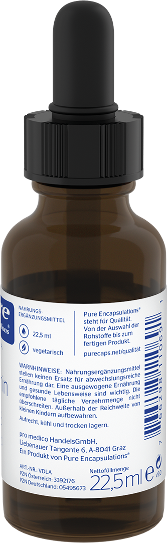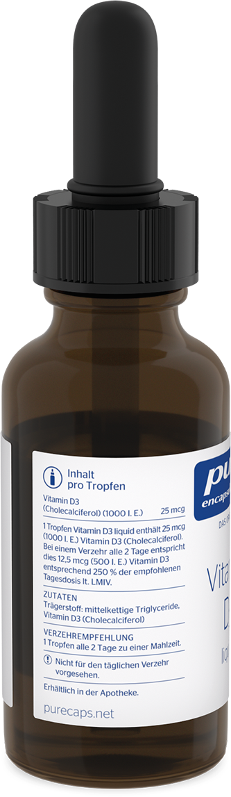 Vitamine D3 liquid de Pure Encapsulations® fournit des gouttes hautement dosées, garanties de qualité contrôlée. La vitamine D3 est dissoute dans une huile neutre et ne contient ni gluten, ni lactose, ni soja, ni additifs superflus. La pipette pratique permet un dosage simple et précis. Chaque goutte apporte 1 000 UI de vitamine D3 et peut être prise directement ou mélangée à un smoothie, un yaourt ou d’autres aliments.