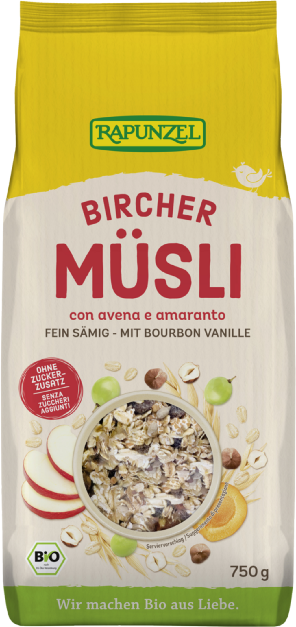 Morceaux de pomme, flocons d'avoine et noisettes. Rapunzel a suivi la recette traditionnelle du médecin suisse Maximilian Bircher qui a inventé ce mélange. Le muesli est ensuite enrichi d'amarante et de vanille Bourbon pour le rendre encore plus gourmand. Le choix parfait pour un début de journée nutritif et végétalien.