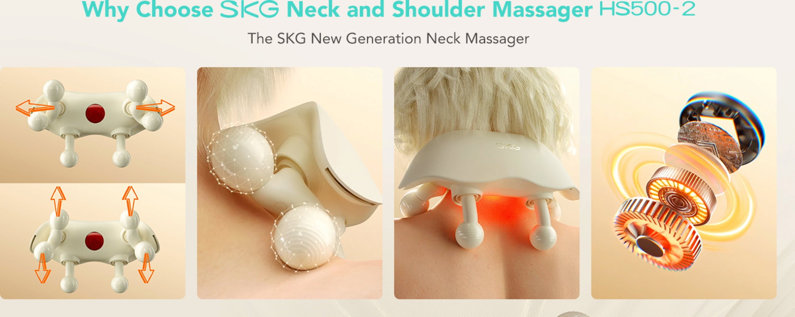 Le SKG HS500-2 repose sur un système double innovant qui associe des mouvements mécaniques roulants et pétrissants. Cette combinaison est spécialement conçue pour travailler de manière étendue la musculature des épaules et de la nuque. Grâce au support élastique à 50° et aux bras de massage flexibles, l’appareil s’adapte à la morphologie naturelle du corps et permet une application précise de la pression, sans frottement désagréable sur la peau.