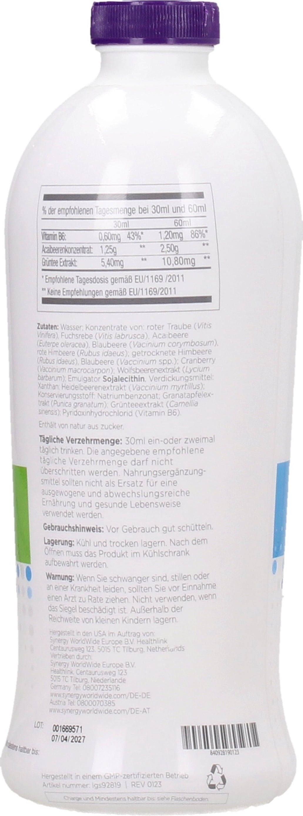 51 % Extrait d'açai, eau purifiée, Raisins rouges, Concord (cépage), Jus de myrtille concentré, concentré de jus de framboise, Framboise en poudre, poudre de myrtille (Myrtilles, amidon de maïs, Maltodextrine, Sucre, Myrtilles[1], Lécithine de soja[3]), 3,6 % Concentré de myrtille du jardin, 0,04 % Jus de myrtille concentré, Benzoate de sodium (E211)[2], Extrait de grenade, Extrait de thé vert[4], Vitamin B6