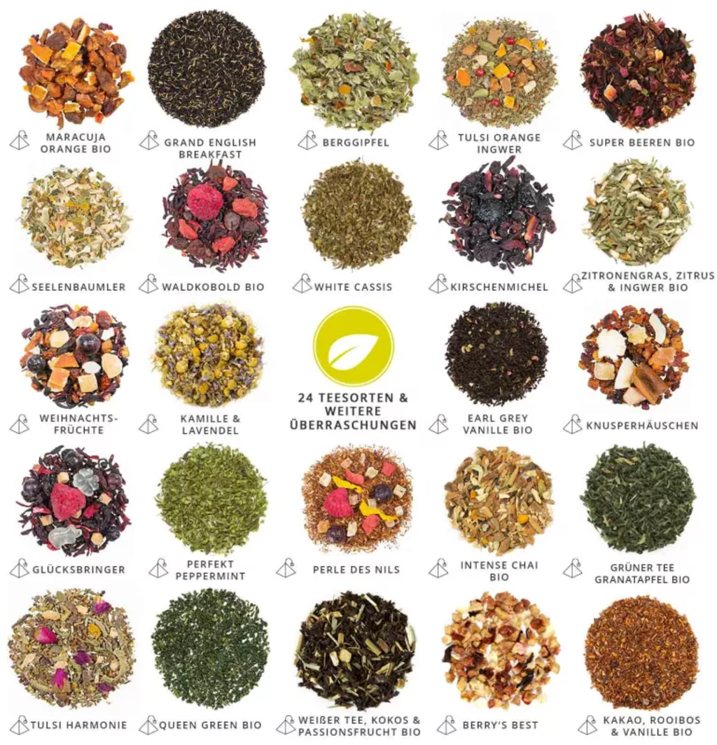 Embarquez pour un voyage captivant à la découverte des meilleurs mélanges de thés et de tisanes du monde entier, présentés dans de grands sachets pyramidaux. Chaque sachet est suffisant pour un maxi mug, deux mugs standard ou une petite théière. Chaque jour, explorez l'un des 24 mélanges et laissez-vous surprendre par cinq autres surprises liées à l'univers du thé.