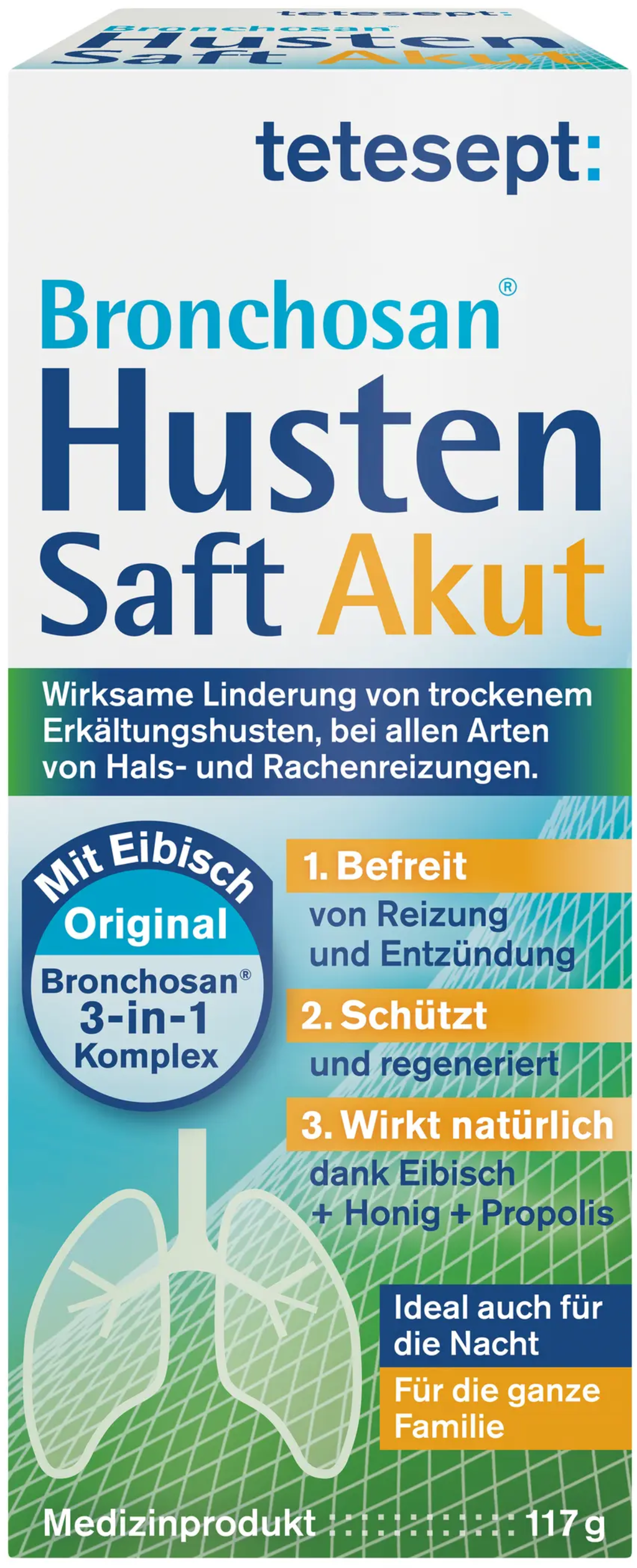 Le sirop pour la toux Acute Bronchosan® de tetesept est enrichi en extrait de racine de guimauve, en miel et en extrait de propolis. Il peut être utilisé chez les enfants à partir de 1 an et convient également à une prise le soir avant le coucher. Sa formule est sans gluten et sans lactose.