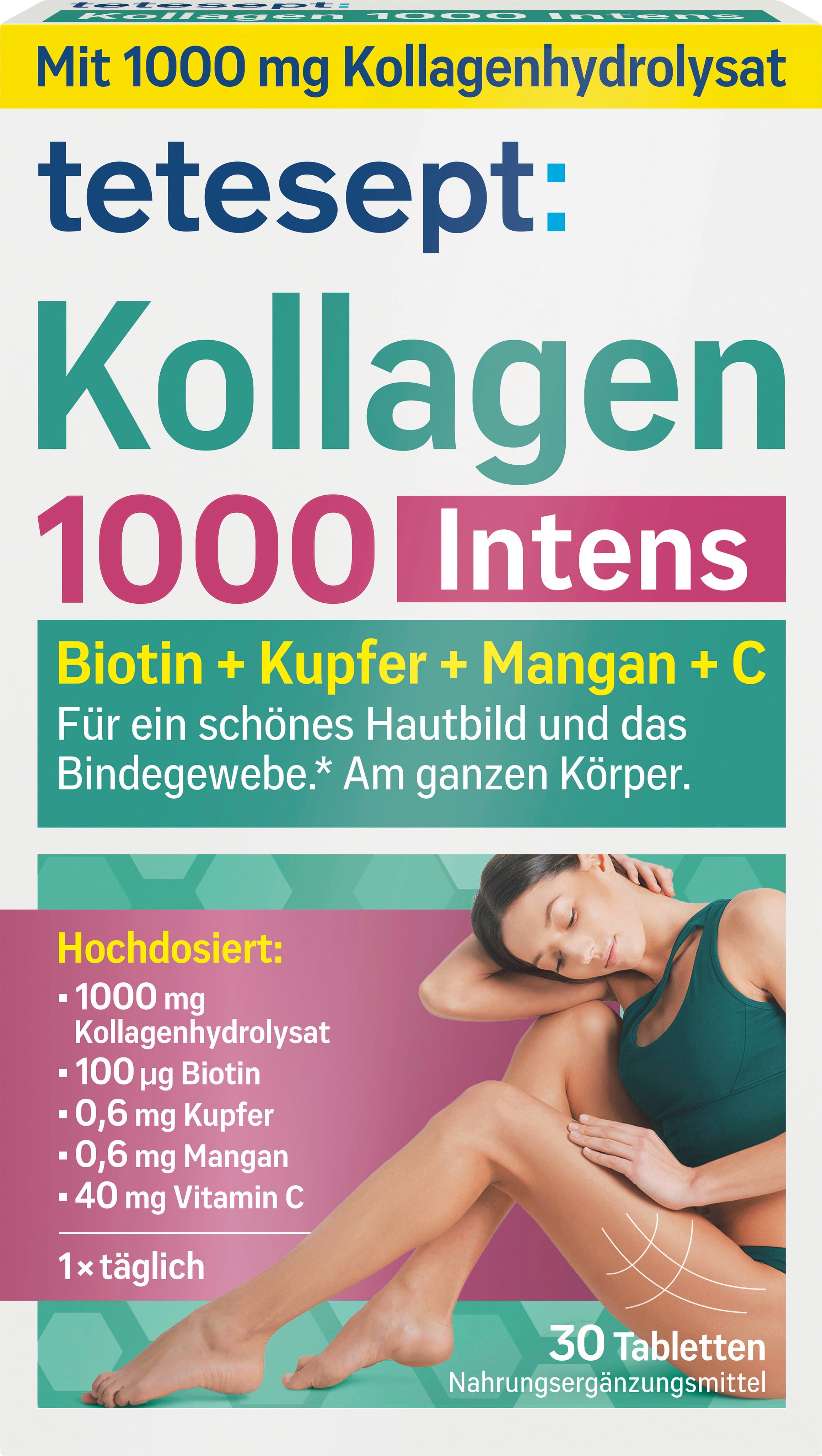 Les comprimés Tetesept Collagen 1000 Intens fournissent 1000 mg d’hydrolysat de collagène par comprimé, complétés par de la biotine, du cuivre, du manganèse et de la vitamine C. La formule est garantie sans gluten et sans lactose.